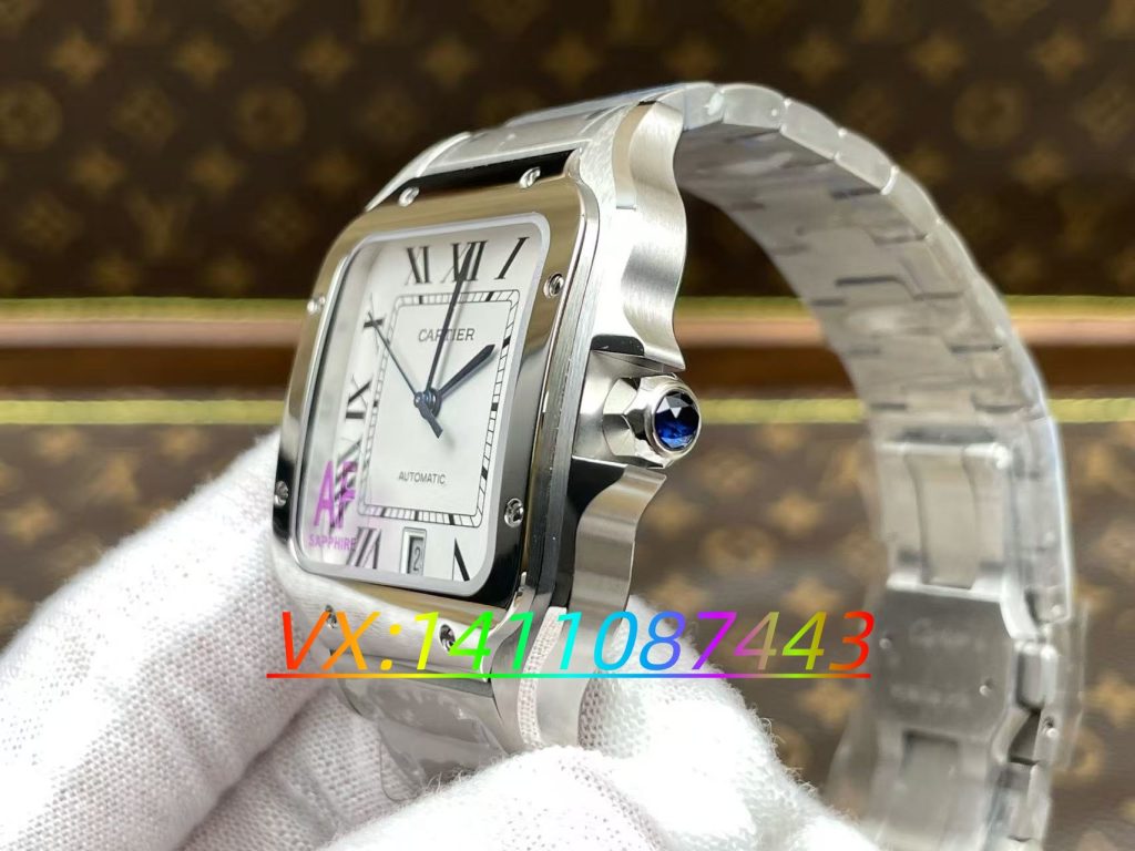 具體來看AF廠男款大號山度士的細節:外殼與表帶均采用316L精鋼材質,搭配藍寶石鏡面,鏡面帶有輕微弧度,完美復刻原版設計。表盤采用成熟的油印工藝,這一點得益于AF廠長期制作卡地亞復刻表的豐富經驗,對他們而言屬于駕輕就熟的工藝。油印刻度質感出眾,無論從哪個角度觀察都清晰立體;七點位置的細節以及品牌防偽logo均精準還原,細節處理堪稱到位。指針采用經典的烤藍鋼針,邊緣還做了弧度打磨,這些容易被忽略的小細節都處理得無可挑剔。
