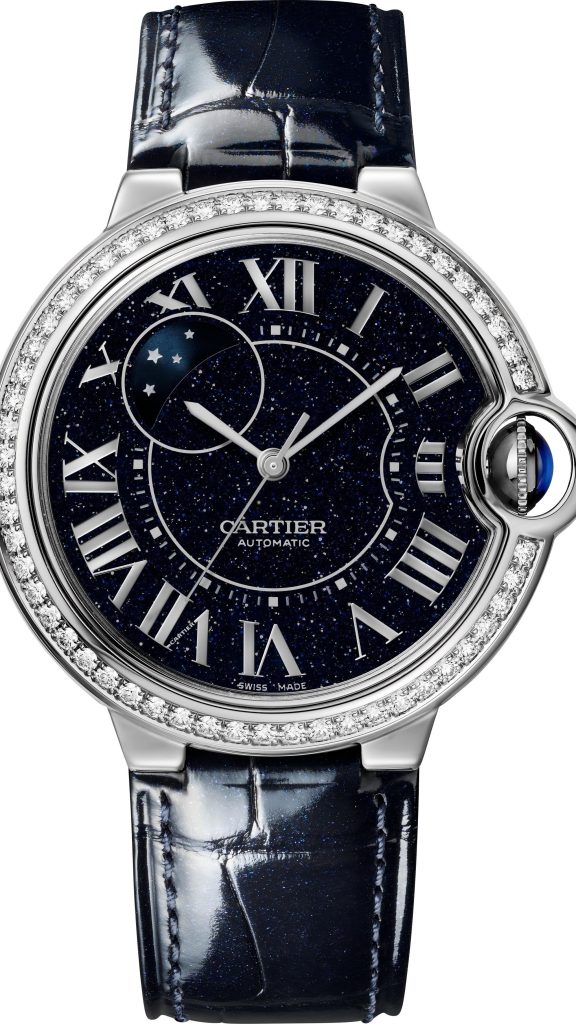 白金表殼搭配同材質表圈,同樣鑲嵌54顆明亮式切割圓鉆(總重0.79克拉);白金表冠鑲嵌半月凸圓形藍寶石,與砂金石玻璃表盤的星點光澤相得益彰。銀色羅馬數字時標搭配鍍銠劍形精鋼指針,亮面珠光深藍色鱷魚皮表帶搭配白金針扣式表扣,盡顯低調奢華。